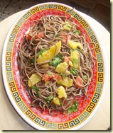 Keitä nuudelit.Itse käytin japanilaisia sobanuudeleita (tattarinuudeleita)koska niiden viimeinen päivämäärä oli juuri edessä,mutta tähän salaattiin sopivat myös riisi-tai sellofaaninuudelit, ja tavallisetkin nuudelit.